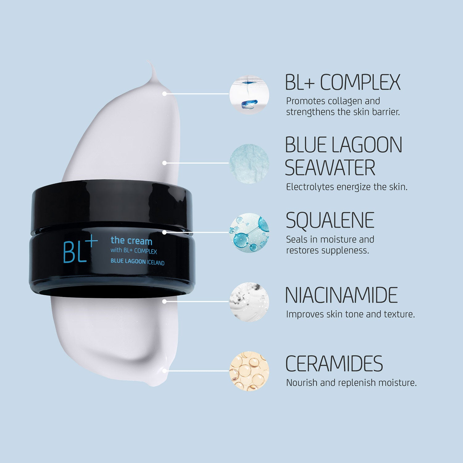 BLUE LAGOON SEAWATER supercharges the skin with electrolytes and boosts the performance of the overall formulation.